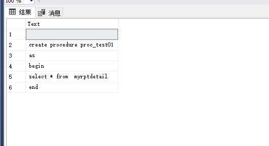 1 create procedure proc_test01 2 as 3 begin 4 select * from myrptdetail 5 end