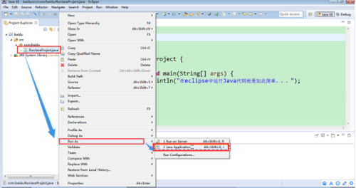 2、右键,选择“Run As”,选择并点击“Java Application”即可。 见下图