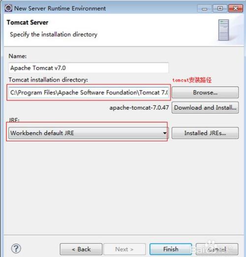 在打开的tomcat Server界面选择好我们的tomcat安装路径,jre就可以之间点击“Finish”按钮了。