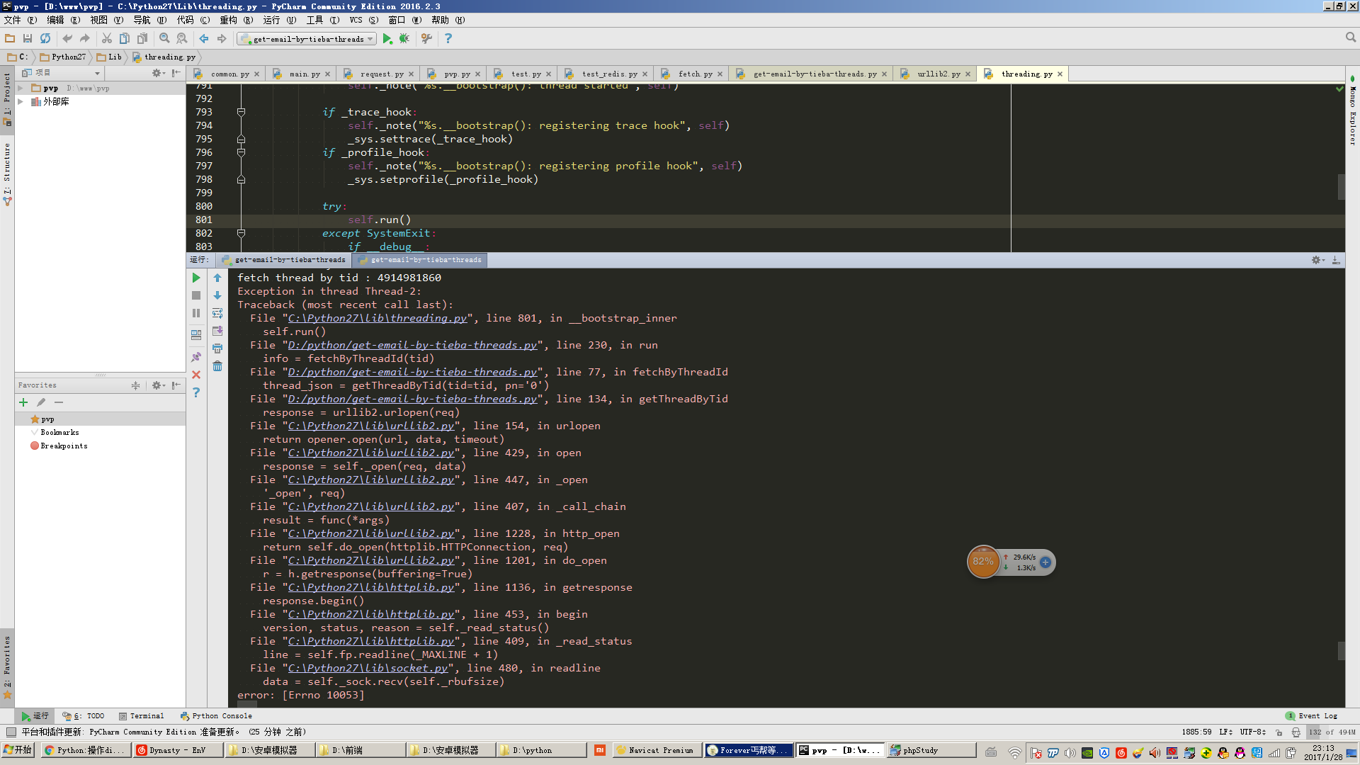 如果大家在网络质量不是很好的环境下使用该爬虫,会发现有的时候会报如图所示的异常,这是我为了偷懒并没有写各种异常处理的逻辑。