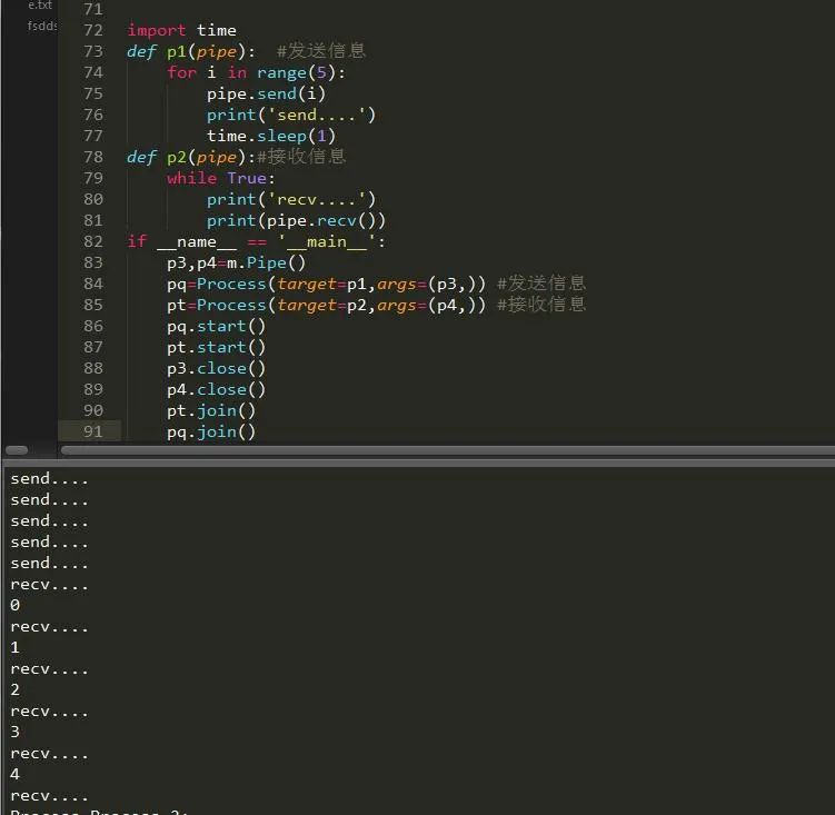p1.send() #发送 p2.recv() #接收 p1.close() #关闭连接 p1.fileno() #返回连接使用的整数文件描述符 p1.poll([timeout]) #如果连接上的数据可用,返回true,timeout指定等待的最长时限。 p2.recv_bytes([maxlength]) #接收最大字节数 p1.send_bytes([maxlength]) #发送最大字节数 #接收一条完整的字节消息,并把它保存在buffer对象中,offset指定缓冲区中放置消息处的字节位移. p2.recv_bytes_into(buffer [, offset])