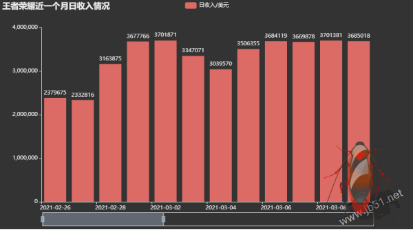王者荣耀是最近几年包括现在一直都是最热销的手游,收益主要来源是游戏里面人物皮肤。今天就来爬取展示王者荣耀近一年收入流水线动图,看看王者荣耀有多赚钱(哈哈哈哈)