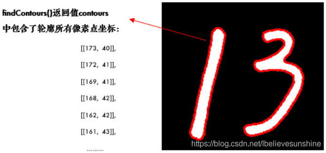 - 函数有2个返回值,hierarchy是轮廓间的层级关系,这个不用理会。我们主要看contours,它就是找到的轮廓了,以链表形式存储,记录了每条轮廓的所有像素点的坐标(x,y)。