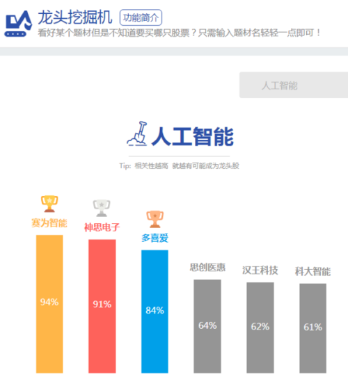 人工智能概念一共有59家上市公司,其中9家人工智能概念上市公司在上证交易所交易,另外50家人工智能概念上市公司在深交所交易。人工智能概念股的龙头股最有可能从 赛为智能、?神思电子、?多喜爱中诞生 。