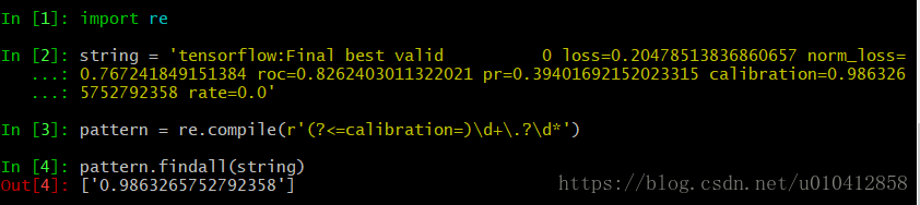 tensorflow:Final best valid 0 loss=0.20478513836860657 norm_loss=0.767241849151384 roc=0.8262403011322021 pr=0.39401692152023315 calibration=0.9863265752792358 rate=0.0 提取 calibration=0.9863265752792358 . # 匹配“calibration=”后面的数字 pattern = re.compile(r'(?<=calibration=)\d+\.?\d*') pattern.findall(string) # ['0.9863265752792358']