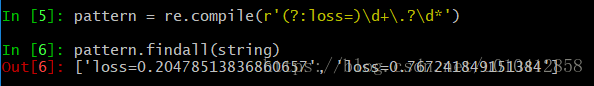 pattern = re.compile(r'(?:loss=)\d+\.?\d*') pattern.findall(string) # ['loss=0.20478513836860657', 'loss=0.767241849151384']