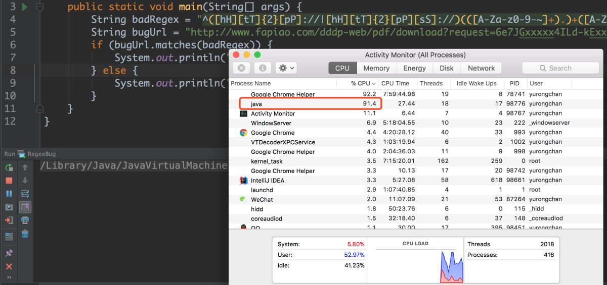 其实这里导致 cpu 使用率高的关键原因就是:java 正则表达式使用的引擎实现是 nfa 自动机,这种正则表达式引擎在进行字符匹配时会发生回溯(backtracking)。而一旦发生回溯,那其消耗的时间就会变得很长,有可能是几分钟,也有可能是几个小时,时间长短取决于回溯的次数和复杂度。