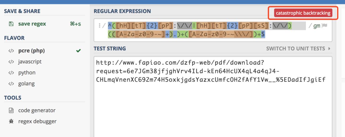 例如我本文中存在问题的那个 url 使用该网站检查后会提示:catastrophic backgracking(灾难性回溯)。