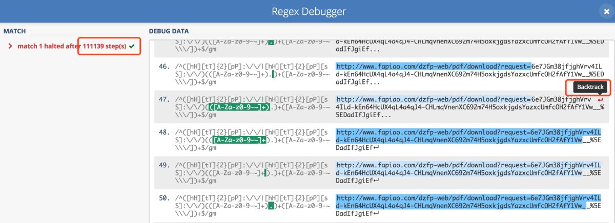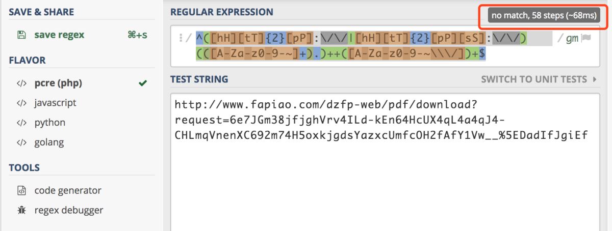com/dzfp-web/pdf/download?request=6e7jgm38jf.....,你会发现因为贪婪匹配的原因,所以程序会一直读后面的字符串进行匹配,最后发现没有点号,于是就一个个字符回溯回去了。