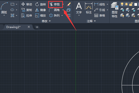 6、选择修剪命令,我们将线段线面的圆弧进行修剪,如图所示: