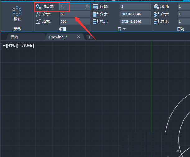 8、画好直线部分图形之后,再在菜单里找到环形阵列选项,选择环形阵列选项然后选择我们刚刚绘制的所有的图形,并指定阵列的圆心点,并在设置里设置项目数为4,如图所示: