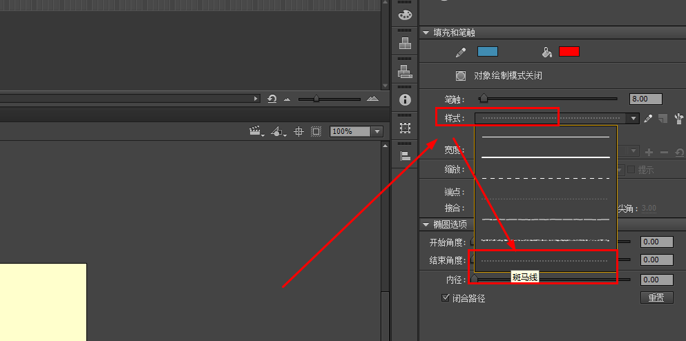 3、这时点击工具属性里的样式,选择斑马线