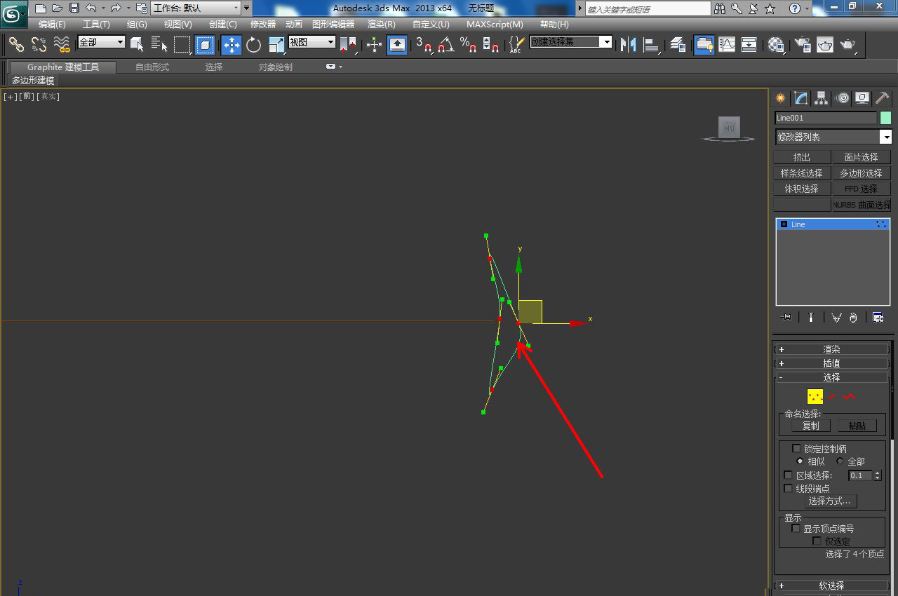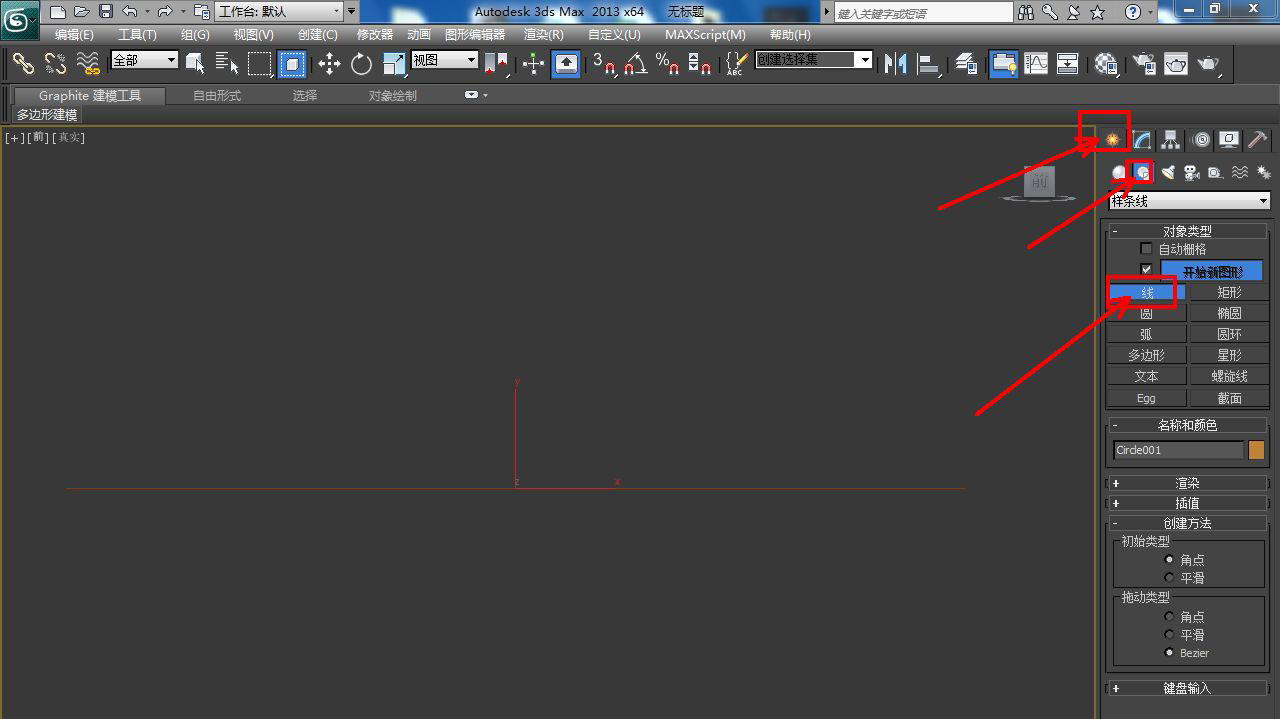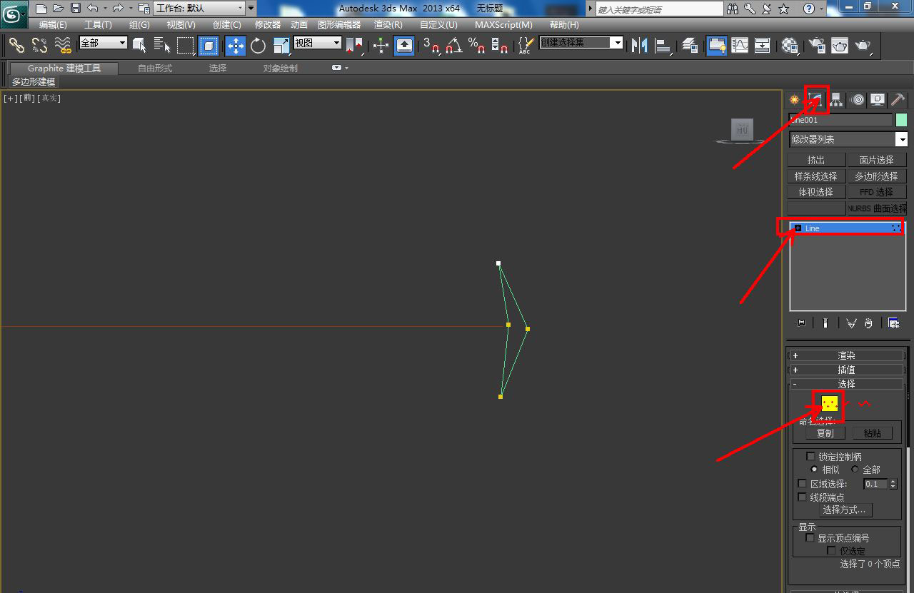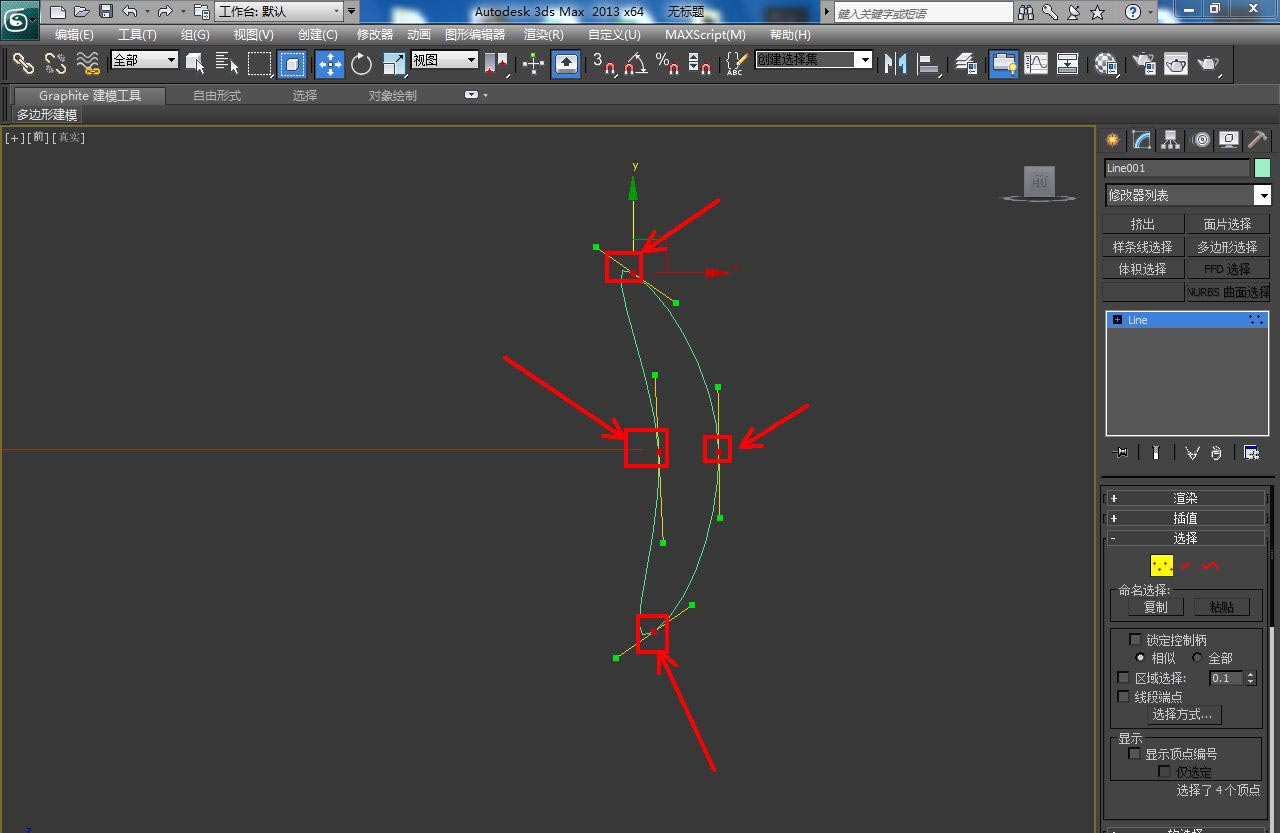 点击【创建】-【线】,按图示绘制一个多段线图案。点击右边工作区中的【顶点】,选中图示图案上的点并进行平滑圆化处理,完成截面图案的绘制;