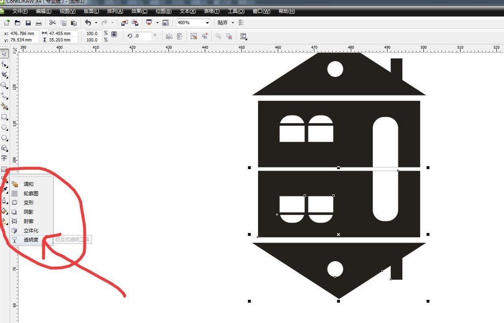 倒影的制作肯定要用到透明度工具,从下往上是逐渐加深的样子,选择调和工具组不要松开,会弹出一个工具组,找到透明度工具。