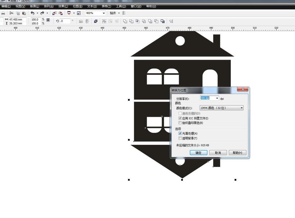 将向下翻转的这个小房子转化为位图,分辨率设置为300,根据自己的需要而定。这样就不在是一个矢量图形了,而变成了一张图片