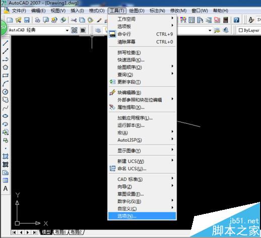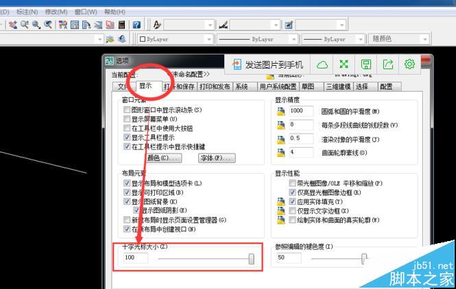2、单击菜单栏里的“工具”,然后选择“选项”,在弹出的对话框里,选择“显示”,然后在左下角调节十字光标的大小,如图所示。