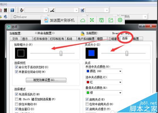 4、在“选项”弹出的对话框中点击“选择”,然后可以调整拾取框大小和夹点大小了。