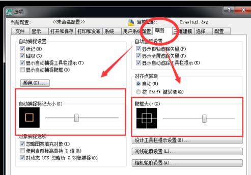 5、在“选项”弹出的对话框中点击“草图”,然后可以调整自动捕捉标记大小和和靶框大小。