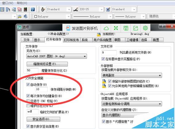 6、最后,点“选项”的的“打开和保存”,可以设置保存时间,一般的选择10分钟就可以了,如果比较熟练可以选择15或者20分以上。注意要勾上创建备份,这样在出现文件突然关闭时或者出现错误时还可以重新找回来。