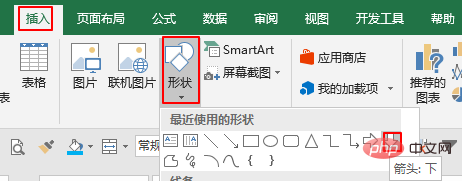 接下来就是把数据标记修改成箭头。点击插入选项卡下,形状—-箭头:下。