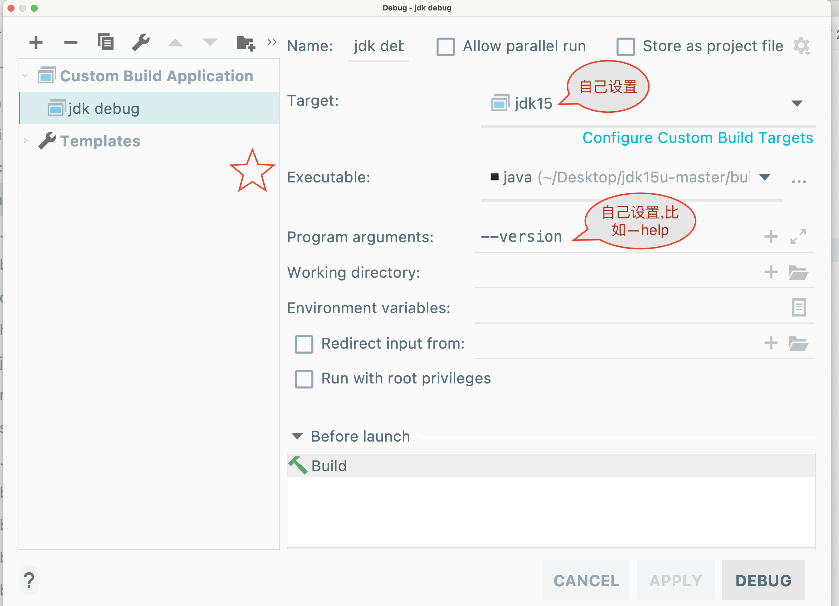 ??target的设置参考https://blog.jetbrains.com/clion/2020/03/openjdk-with-clion/的Step 3: Generate Run Configurations and Build Targets部分,把里面的fastdebug改为slowdebug即可.