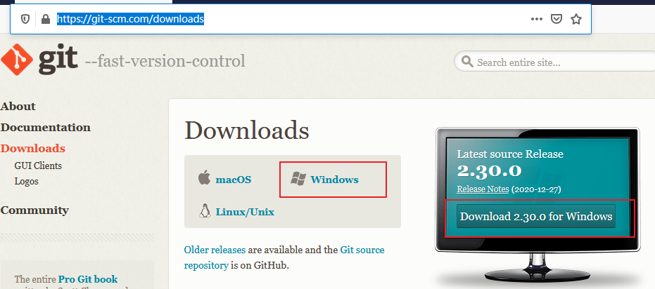 1. 一般我们工作的电脑都是windows系统,要使用git首先要进行安装。从官网的下载页面中下载git的windows安装包。如下图。