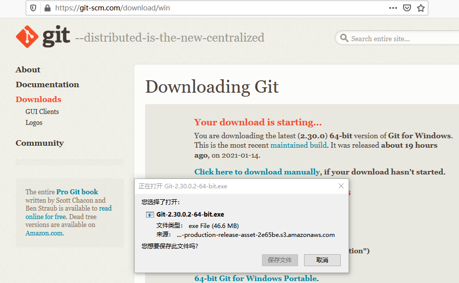3. 在下载目录中找到刚才下载的文件git-2.30.0.2-64-bit.exe,使用鼠标双击,然后默认安装即可。