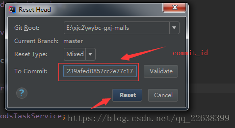 也可以直接使用idea的reset head 功能,先通过git log 得到要回退的commit_id,再进行下面截图的操作。可以先validate一下哦,看通过commit_id能不能找到这一次提交。