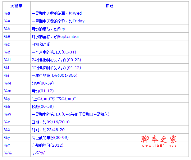 date函数的格式化标识和C运行时库中的strftime函数的标识完全相同,见下表: