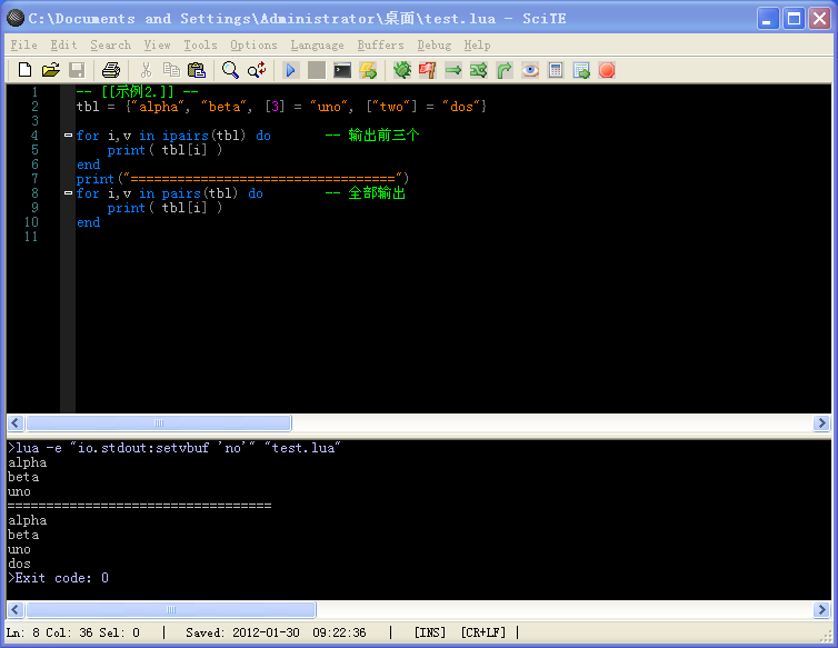 这样就可以看出 ipairs以及pairs 的不同。pairs可以遍历表中所有的key,并且除了迭代器本身以及遍历表本身还可以返回nil;但是ipairs则不能返回nil,只能返回数字0,如果遇到nil则退出。它只能遍历到表中出现的第一个不是整数的key