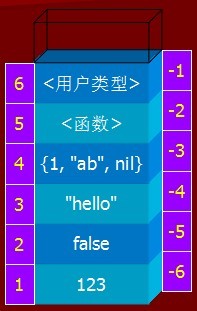 若lua虚拟机堆栈里有n个元素,则可以用 1 ~ n 从栈底向上索引,也可以用 -1 ~ -n 从栈顶向下索引,一般后者更加常用。