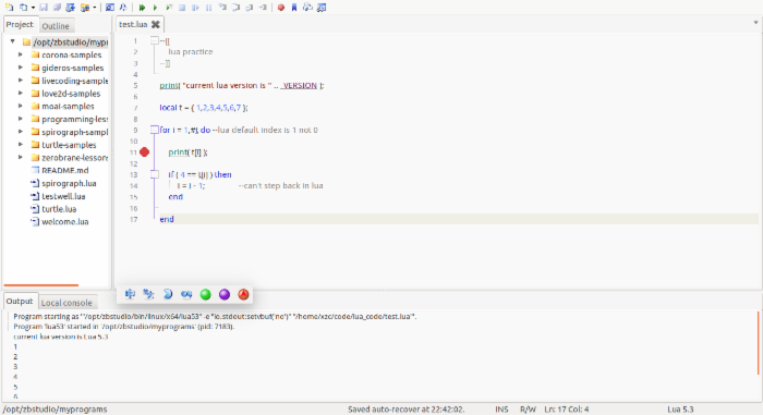 学习新的语言,应该是先编译、安装、部署开发调试环境,然后练习...可是,我现在并没有项目做啊,我只是想先熟悉一下lua的语法,没必要这么复杂。于是便开始找个简单的lua ide。挑来挑去,选了个 zerobrane studio ,原因是它小巧,可以单步调试。另外,在linux下也不是有那么多的选择的,我可不想刚开始学就用个sublime text写个xxx.lua再到shell去执行lua xxx.lua。