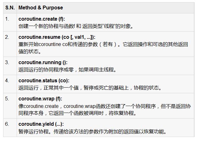 下表列出了在lua协同程序及其相应的使用所有的可用功能。