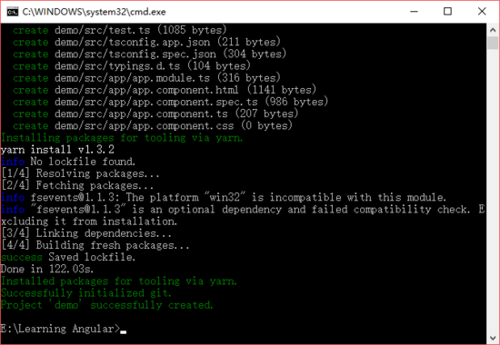 当出现类似上面的界面,提示“projecy ‘demo' successfully created”时,表示项目已经创建完成。如果有错误,需要检查安装过程或者网络连接等。