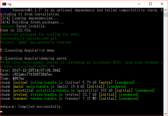 创建一个演示项目。 new 是创建一个全新项目,后面的 demo 是项目的名字。angular cli 会帮我们生成完整的项目框架——包括项目所需所有文件、文件结构以及各种辅助文件等。之后,angular cli 会自动运行 yarn install ,这是在安装项目所需要的各种依赖。安装过程会比较漫长,需要耐心等待一段时间。