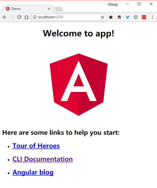 可以看到 angular cli 默认生成的项目页面的运行结果。