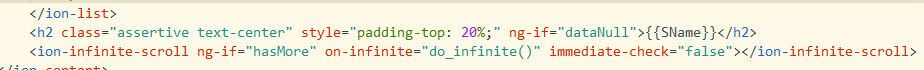 其中hasmore是布尔值判断是否还有更多数据。然后在请求参数currentpage的值是用累加的。用for循环把返回的数据push到已有数据的数组中,再判断当前的数组长度(也就是获取到本地的总条数)是否等于请求到返回数据总条数属性的值。如果这布尔值为true说明还有数据。同上 $scope.$broadcast("scroll.infinitescrollcomplete"); 也是刷新页面数据。在页面中只要在ion-list下面添加<ion-infinite-scroll ng-if="hasmore" on-infinite="do_infinite()" immediate-check="false"></ion-infinite-scroll> 就可以执行。