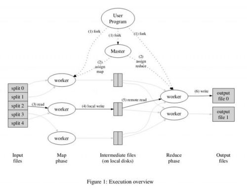 上图是论文里给出的流程图。一切都是从最上方的user program开始的,user program链接了MapReduce库,实现了最基本的Map函数和Reduce函数。图中执行的顺序都用数字标记了。