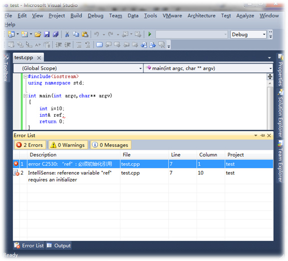 首先,引用不可以为空,但指针可以为空。前面也说过了引用是对象的别名,引用为空——对象都不存在,怎么可能有别名!故定义一个引用的时候,必须初始化。因此如果你有一个变量是用于指向另一个对象,但是它可能为空,这时你应该使用指针;如果变量总是指向一个对象,i.e.,你的设计不允许变量为空,这时你应该使用引用。如下图中,如果定义一个引用变量,不初始化的话连编译都通不过(编译时错误):