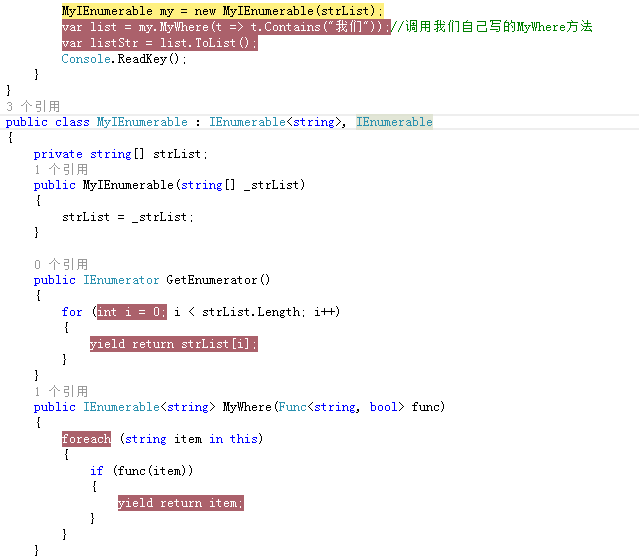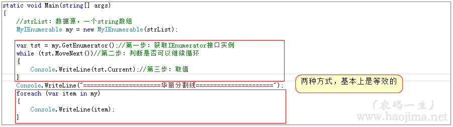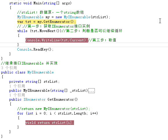 我们自己写的MyIEnumerable删掉后面的IEnumerable接口一样可以foreach(不信?自己去测试)。