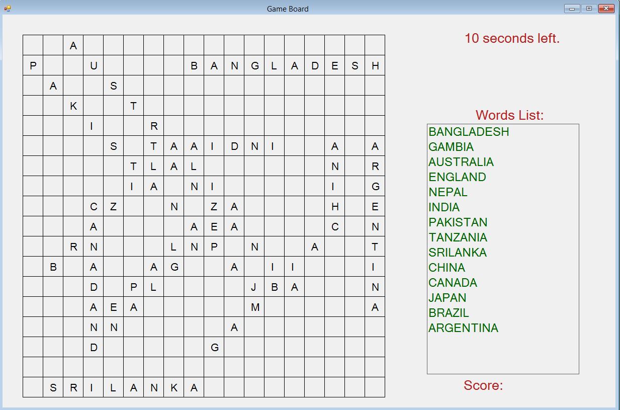 单词通过InitializeBoard()方法被放置在网格上。我们在字符矩阵(二维字符数组)WORDS_IN_BOARD中先放置单词。然后我们在网格中映射这个矩阵。遍历所有的单词。每个单词获取随机方向(水平/垂直/左下/右下)下的随机位置。此时,如果我们可视化的话,单词矩阵看起来会有点像下面这样。
