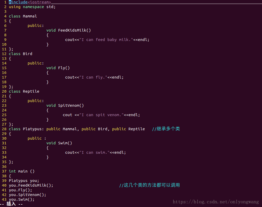 某个类可以继承多个基类,比如鸭嘴兽可以继承哺乳类(喂奶),鸟类(生蛋),爬行类(分泌毒液)。写法也很简单: