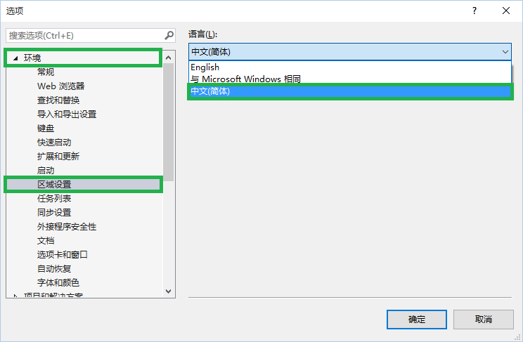 打开 Visual Studio,选择:Tools -> Options -> Environment -> International Settings,在右侧出现语言配置选项。Language 默认是当前的 English,点击下拉箭头,选择中文(简体),点击确定。
