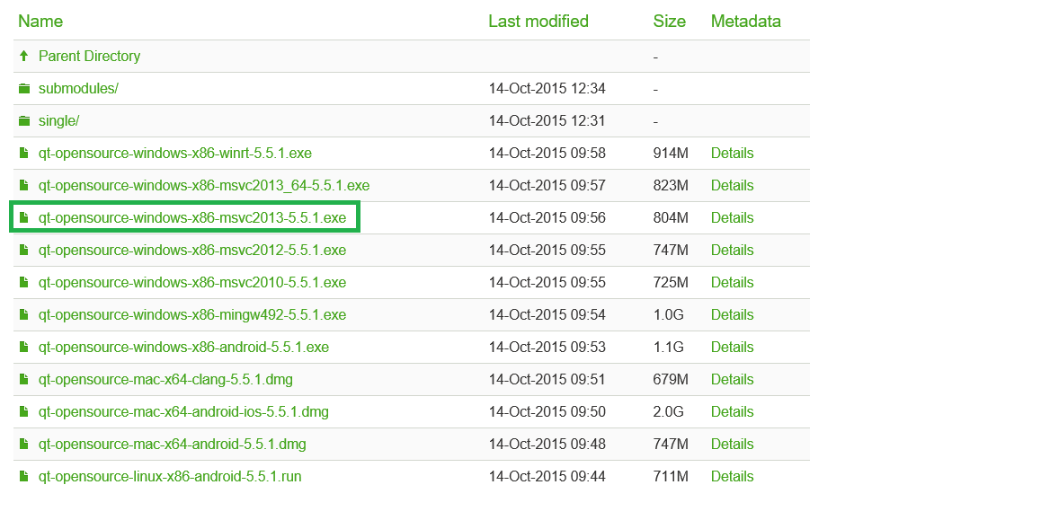 这里,我选择的版本为:qt-opensource-windows-x86-msvc2013-5.5.1.exe(32 位支持 Visual Studio 2013)