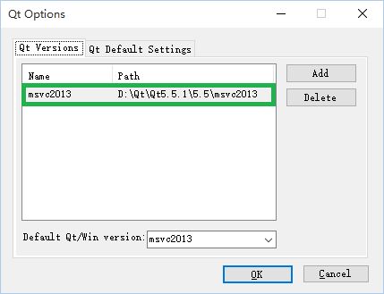这里根据 Qt 安装路径进行选择,Path 为:D:\Qt\Qt5.5.1\5.5\msvc2013。