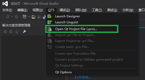 选择:QT5 -> Open Qt Project File(.pro)…
