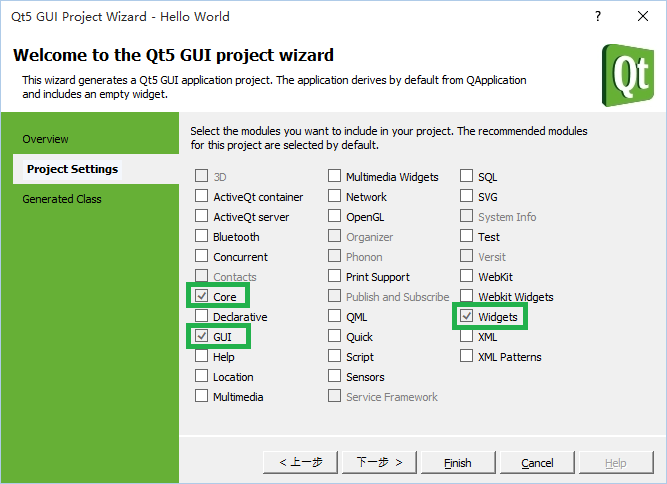 3、选择依赖的模块:最基础的 QtCore、QtGui、QtWidgets 还有一些音/视频、网络、数据库、XML、OpenGl 相关的模块,需要使用的直接勾选即可。