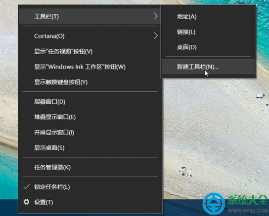1、首先在任务栏的空白处单击鼠标右键,跳出选单以后选择【工具栏】→【新建工具栏】。