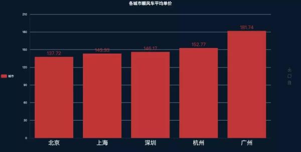 原本是想比较一下平均路程长度,但是想想这个事情太折腾了,由于平台主要还是依靠路程来计算拼车费用的,所以通过计算客单价的话大概也能反映一下平均形成长度(我猜的,然后结果是这样的,没想到广州是最高的,也可能是我统计错误