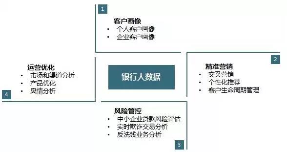 国内不少银行已经开始尝试通过大数据来驱动业务运营,如中信银行信用卡中心使用大数据技术实现了实时营销,光大银行建立了社交网络信息数据库,招商银行则利用大数据发展小微贷款。从发展趋势来看,银行大数据应用总的可以分为四大方面: